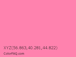 XYZ 56.863,40.281,44.822 Color is a light rose color and the nearest color is Tickle Me Pink #fc89ac. Hex code #ff82ae and RGB value is rgb(255,130,174). In RGB color space, this color is composed of 100% red, 51% green, 68% blue, In CMYK color space, this color is composed of 0% cyan, 49% magenta, 32% yellow , 0% black , In HSL color space, this color has a hue angle of 339° , 100% saturation and 75% lightness.