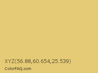 XYZ 56.88,60.654,25.539 Color is a light yellow color and the nearest color is Rob Roy #eac674. Hex code #e5cb75 and RGB value is rgb(229,203,117). In RGB color space, this color is composed of 90% red, 80% green, 46% blue, In CMYK color space, this color is composed of 0% cyan, 11% magenta, 49% yellow , 10% black , In HSL color space, this color has a hue angle of 46° , 68% saturation and 68% lightness.