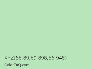XYZ 56.89,69.898,56.948 Color is a very light green color and the nearest color is Fringy Flower #b1e2c1. Hex code #b9e5ba and RGB value is rgb(185,229,186). In RGB color space, this color is composed of 73% red, 90% green, 73% blue, In CMYK color space, this color is composed of 19% cyan, 0% magenta, 19% yellow , 10% black , In HSL color space, this color has a hue angle of 121° , 46% saturation and 81% lightness.