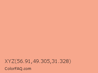 XYZ 56.91,49.305,31.328 Color is a light color and the nearest color is Vivid Tangerine #ffa089. Hex code #f7a78c and RGB value is rgb(247,167,140). In RGB color space, this color is composed of 97% red, 65% green, 55% blue, In CMYK color space, this color is composed of 0% cyan, 32% magenta, 43% yellow , 3% black , In HSL color space, this color has a hue angle of 15° , 87% saturation and 76% lightness.