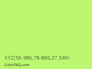 XYZ 56.986,78.869,27.549 Color is a light green color and the nearest color is Sulu #c1f07c. Hex code #bbf870 and RGB value is rgb(187,248,112). In RGB color space, this color is composed of 73% red, 97% green, 44% blue, In CMYK color space, this color is composed of 25% cyan, 0% magenta, 55% yellow , 3% black , In HSL color space, this color has a hue angle of 87° , 91% saturation and 71% lightness.