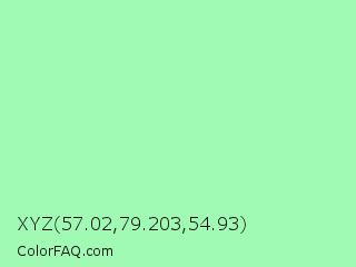 XYZ 57.02,79.203,54.93 Color is a very light green color and the nearest color is Teal Deer #99e6b3. Hex code #a1fab3 and RGB value is rgb(161,250,179). In RGB color space, this color is composed of 63% red, 98% green, 70% blue, In CMYK color space, this color is composed of 36% cyan, 0% magenta, 28% yellow , 2% black , In HSL color space, this color has a hue angle of 132° , 90% saturation and 81% lightness.