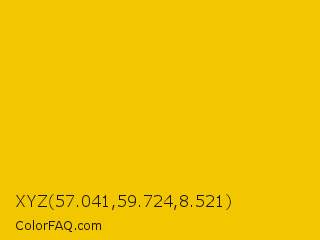 XYZ 57.041,59.724,8.521 Color is a normal yellow color and the nearest color is Yellow Munsell #efcc00. Hex code #f2c700 and RGB value is rgb(242,199,0). In RGB color space, this color is composed of 95% red, 78% green, 0% blue, In CMYK color space, this color is composed of 0% cyan, 18% magenta, 100% yellow , 5% black , In HSL color space, this color has a hue angle of 49° , 100% saturation and 47% lightness.
