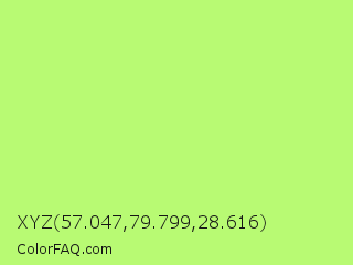 XYZ 57.047,79.799,28.616 Color is a light green color and the nearest color is Sulu #c1f07c. Hex code #b8fa73 and RGB value is rgb(184,250,115). In RGB color space, this color is composed of 72% red, 98% green, 45% blue, In CMYK color space, this color is composed of 26% cyan, 0% magenta, 54% yellow , 2% black , In HSL color space, this color has a hue angle of 89° , 93% saturation and 72% lightness.
