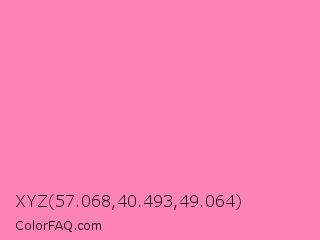 XYZ 57.068,40.493,49.064 Color is a light rose color and the nearest color is Persian Pink #f77fbe. Hex code #fd83b6 and RGB value is rgb(253,131,182). In RGB color space, this color is composed of 99% red, 51% green, 71% blue, In CMYK color space, this color is composed of 0% cyan, 48% magenta, 28% yellow , 1% black , In HSL color space, this color has a hue angle of 335° , 97% saturation and 75% lightness.