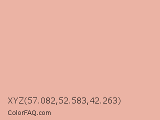 XYZ 57.082,52.583,42.263 Color is a light red color and the nearest color is Cashmere #e6bea5. Hex code #ebb3a4 and RGB value is rgb(235,179,164). In RGB color space, this color is composed of 92% red, 70% green, 64% blue, In CMYK color space, this color is composed of 0% cyan, 24% magenta, 30% yellow , 8% black , In HSL color space, this color has a hue angle of 13° , 64% saturation and 78% lightness.