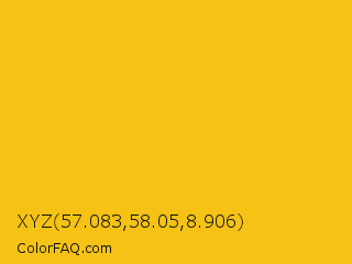 XYZ 57.083,58.05,8.906 Color is a normal yellow color and the nearest color is Deep Lemon #f5c71a. Hex code #f5c215 and RGB value is rgb(245,194,21). In RGB color space, this color is composed of 96% red, 76% green, 8% blue, In CMYK color space, this color is composed of 0% cyan, 21% magenta, 91% yellow , 4% black , In HSL color space, this color has a hue angle of 46° , 92% saturation and 52% lightness.