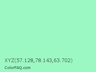 XYZ 57.128,78.143,63.702 Color is a light green color and the nearest color is Magic Mint #aaf0d1. Hex code #9cf8c3 and RGB value is rgb(156,248,195). In RGB color space, this color is composed of 61% red, 97% green, 76% blue, In CMYK color space, this color is composed of 37% cyan, 0% magenta, 21% yellow , 3% black , In HSL color space, this color has a hue angle of 145° , 87% saturation and 79% lightness.
