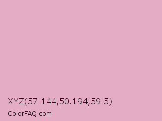 XYZ 57.144,50.194,59.5 Color is a light rose color and the nearest color is Pink Pearl #e7accf. Hex code #e5acc5 and RGB value is rgb(229,172,197). In RGB color space, this color is composed of 90% red, 67% green, 77% blue, In CMYK color space, this color is composed of 0% cyan, 25% magenta, 14% yellow , 10% black , In HSL color space, this color has a hue angle of 334° , 52% saturation and 79% lightness.