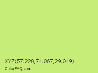 XYZ 57.228,74.067,29.049 Color is a light lime color and the nearest color is Sulu #c1f07c. Hex code #c7ed78 and RGB value is rgb(199,237,120). In RGB color space, this color is composed of 78% red, 93% green, 47% blue, In CMYK color space, this color is composed of 16% cyan, 0% magenta, 49% yellow , 7% black , In HSL color space, this color has a hue angle of 79° , 76% saturation and 70% lightness.