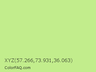 XYZ 57.266,73.931,36.063 Color is a light green color and the nearest color is Sulu #c1f07c. Hex code #c2ed8c and RGB value is rgb(194,237,140). In RGB color space, this color is composed of 76% red, 93% green, 55% blue, In CMYK color space, this color is composed of 18% cyan, 0% magenta, 41% yellow , 7% black , In HSL color space, this color has a hue angle of 87° , 73% saturation and 74% lightness.
