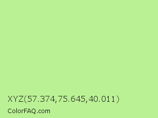 XYZ 57.374,75.645,40.011 Color is a light green color and the nearest color is Reef #c9ffa2. Hex code #bbf195 and RGB value is rgb(187,241,149). In RGB color space, this color is composed of 73% red, 95% green, 58% blue, In CMYK color space, this color is composed of 22% cyan, 0% magenta, 38% yellow , 5% black , In HSL color space, this color has a hue angle of 95° , 77% saturation and 76% lightness.