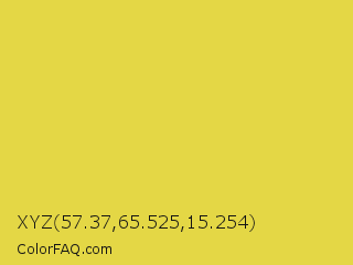 XYZ 57.37,65.525,15.254 Color is a normal yellow color and the nearest color is Wattle #dcd747. Hex code #e4d745 and RGB value is rgb(228,215,69). In RGB color space, this color is composed of 89% red, 84% green, 27% blue, In CMYK color space, this color is composed of 0% cyan, 6% magenta, 70% yellow , 11% black , In HSL color space, this color has a hue angle of 55° , 75% saturation and 58% lightness.