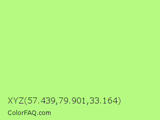 XYZ 57.439,79.901,33.164 Color is a light green color and the nearest color is Sulu #c1f07c. Hex code #b6fa81 and RGB value is rgb(182,250,129). In RGB color space, this color is composed of 71% red, 98% green, 51% blue, In CMYK color space, this color is composed of 27% cyan, 0% magenta, 48% yellow , 2% black , In HSL color space, this color has a hue angle of 94° , 92% saturation and 74% lightness.