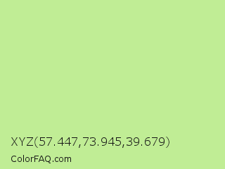 XYZ 57.447,73.945,39.679 Color is a light green color and the nearest color is Medium Spring Bud #c9dc87. Hex code #c0ed95 and RGB value is rgb(192,237,149). In RGB color space, this color is composed of 75% red, 93% green, 58% blue, In CMYK color space, this color is composed of 19% cyan, 0% magenta, 37% yellow , 7% black , In HSL color space, this color has a hue angle of 91° , 71% saturation and 76% lightness.