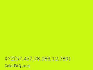 XYZ 57.457,78.983,12.789 Color is a normal lime color and the nearest color is Arctic Lime #d0ff14. Hex code #c9f712 and RGB value is rgb(201,247,18). In RGB color space, this color is composed of 79% red, 97% green, 7% blue, In CMYK color space, this color is composed of 19% cyan, 0% magenta, 93% yellow , 3% black , In HSL color space, this color has a hue angle of 72° , 93% saturation and 52% lightness.