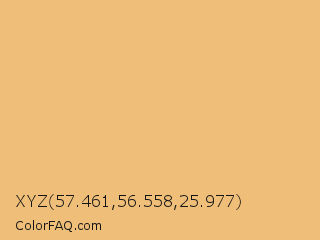 XYZ 57.461,56.558,25.977 Color is a light orange color and the nearest color is Rob Roy #eac674. Hex code #efbe79 and RGB value is rgb(239,190,121). In RGB color space, this color is composed of 94% red, 75% green, 47% blue, In CMYK color space, this color is composed of 0% cyan, 21% magenta, 49% yellow , 6% black , In HSL color space, this color has a hue angle of 35° , 79% saturation and 71% lightness.