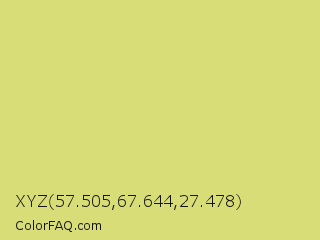 XYZ 57.505,67.644,27.478 Color is a light yellow color and the nearest color is Booger Buster #dde26a. Hex code #d8dd77 and RGB value is rgb(216,221,119). In RGB color space, this color is composed of 85% red, 87% green, 47% blue, In CMYK color space, this color is composed of 2% cyan, 0% magenta, 46% yellow , 13% black , In HSL color space, this color has a hue angle of 63° , 60% saturation and 67% lightness.