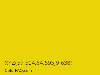 XYZ 57.514,64.595,9.638 Color is a normal yellow color and the nearest color is Safety Yellow #eed202. Hex code #ead407 and RGB value is rgb(234,212,7). In RGB color space, this color is composed of 92% red, 83% green, 3% blue, In CMYK color space, this color is composed of 0% cyan, 9% magenta, 97% yellow , 8% black , In HSL color space, this color has a hue angle of 54° , 94% saturation and 47% lightness.