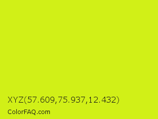 XYZ 57.609,75.937,12.432 Color is a normal yellow color and the nearest color is Arctic Lime #d0ff14. Hex code #d1f017 and RGB value is rgb(209,240,23). In RGB color space, this color is composed of 82% red, 94% green, 9% blue, In CMYK color space, this color is composed of 13% cyan, 0% magenta, 90% yellow , 6% black , In HSL color space, this color has a hue angle of 69° , 88% saturation and 52% lightness.