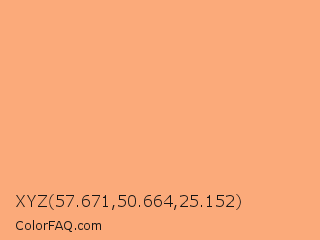 XYZ 57.671,50.664,25.152 Color is a light orange color and the nearest color is Very Light Tangelo #ffb077. Hex code #fbaa7a and RGB value is rgb(251,170,122). In RGB color space, this color is composed of 98% red, 67% green, 48% blue, In CMYK color space, this color is composed of 0% cyan, 32% magenta, 51% yellow , 2% black , In HSL color space, this color has a hue angle of 22° , 94% saturation and 73% lightness.