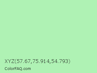 XYZ 57.67,75.914,54.793 Color is a very light green color and the nearest color is Madang #b7f0be. Hex code #aff2b4 and RGB value is rgb(175,242,180). In RGB color space, this color is composed of 69% red, 95% green, 71% blue, In CMYK color space, this color is composed of 28% cyan, 0% magenta, 26% yellow , 5% black , In HSL color space, this color has a hue angle of 124° , 72% saturation and 82% lightness.