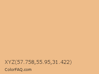 XYZ 57.758,55.95,31.422 Color is a light orange color and the nearest color is Gold Sand #e6be8a. Hex code #eebc89 and RGB value is rgb(238,188,137). In RGB color space, this color is composed of 93% red, 74% green, 54% blue, In CMYK color space, this color is composed of 0% cyan, 21% magenta, 42% yellow , 7% black , In HSL color space, this color has a hue angle of 30° , 75% saturation and 74% lightness.