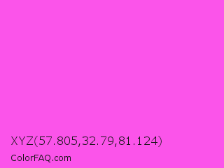 XYZ 57.805,32.79,81.124 Color is a light magenta color and the nearest color is Purple Pizzazz #fe4eda. Hex code #fb54ea and RGB value is rgb(251,84,234). In RGB color space, this color is composed of 98% red, 33% green, 92% blue, In CMYK color space, this color is composed of 0% cyan, 67% magenta, 7% yellow , 2% black , In HSL color space, this color has a hue angle of 306° , 95% saturation and 66% lightness.