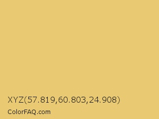 XYZ 57.819,60.803,24.908 Color is a light orange color and the nearest color is Rob Roy #eac674. Hex code #e9ca73 and RGB value is rgb(233,202,115). In RGB color space, this color is composed of 91% red, 79% green, 45% blue, In CMYK color space, this color is composed of 0% cyan, 13% magenta, 51% yellow , 9% black , In HSL color space, this color has a hue angle of 44° , 73% saturation and 68% lightness.