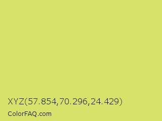 XYZ 57.854,70.296,24.429 Color is a light yellow color and the nearest color is Booger Buster #dde26a. Hex code #d6e36b and RGB value is rgb(214,227,107). In RGB color space, this color is composed of 84% red, 89% green, 42% blue, In CMYK color space, this color is composed of 6% cyan, 0% magenta, 53% yellow , 11% black , In HSL color space, this color has a hue angle of 67° , 68% saturation and 65% lightness.