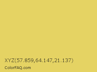 XYZ 57.859,64.147,21.137 Color is a light yellow color and the nearest color is Hansa Yellow #e9d66b. Hex code #e5d363 and RGB value is rgb(229,211,99). In RGB color space, this color is composed of 90% red, 83% green, 39% blue, In CMYK color space, this color is composed of 0% cyan, 8% magenta, 57% yellow , 10% black , In HSL color space, this color has a hue angle of 52° , 71% saturation and 64% lightness.