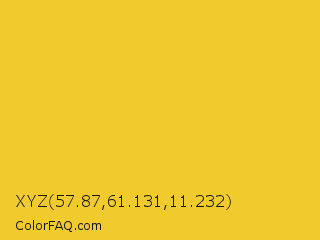 XYZ 57.87,61.131,11.232 Color is a normal yellow color and the nearest color is Saffron #f4c430. Hex code #f1ca2d and RGB value is rgb(241,202,45). In RGB color space, this color is composed of 95% red, 79% green, 18% blue, In CMYK color space, this color is composed of 0% cyan, 16% magenta, 81% yellow , 5% black , In HSL color space, this color has a hue angle of 48° , 88% saturation and 56% lightness.