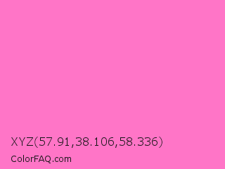 XYZ 57.91,38.106,58.336 Color is a light magenta color and the nearest color is Persian Pink #f77fbe. Hex code #ff75c7 and RGB value is rgb(255,117,199). In RGB color space, this color is composed of 100% red, 46% green, 78% blue, In CMYK color space, this color is composed of 0% cyan, 54% magenta, 22% yellow , 0% black , In HSL color space, this color has a hue angle of 324° , 100% saturation and 73% lightness.