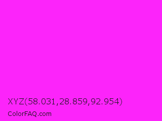 XYZ 58.031,28.859,92.954 Color is a normal magenta color and the nearest color is Magenta / Fuchsia #ff00ff. Hex code #fc24fa and RGB value is rgb(252,36,250). In RGB color space, this color is composed of 99% red, 14% green, 98% blue, In CMYK color space, this color is composed of 0% cyan, 86% magenta, 1% yellow , 1% black , In HSL color space, this color has a hue angle of 301° , 97% saturation and 56% lightness.