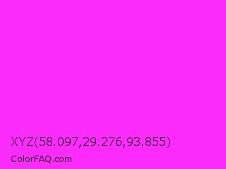 XYZ 58.097,29.276,93.855 Color is a normal magenta color and the nearest color is Magenta / Fuchsia #ff00ff. Hex code #fb2cfb and RGB value is rgb(251,44,251). In RGB color space, this color is composed of 98% red, 17% green, 98% blue, In CMYK color space, this color is composed of 0% cyan, 82% magenta, 0% yellow , 2% black , In HSL color space, this color has a hue angle of 300° , 96% saturation and 58% lightness.