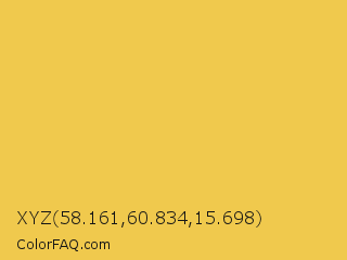 XYZ 58.161,60.834,15.698 Color is a light yellow color and the nearest color is Ronchi #ecc54e. Hex code #f0c94d and RGB value is rgb(240,201,77). In RGB color space, this color is composed of 94% red, 79% green, 30% blue, In CMYK color space, this color is composed of 0% cyan, 16% magenta, 68% yellow , 6% black , In HSL color space, this color has a hue angle of 46° , 84% saturation and 62% lightness.