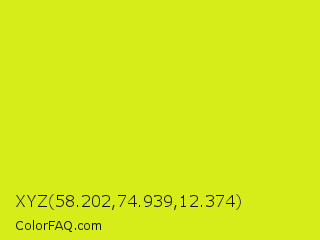 XYZ 58.202,74.939,12.374 Color is a normal yellow color and the nearest color is Piss Yellow #e1e115. Hex code #d6ed1a and RGB value is rgb(214,237,26). In RGB color space, this color is composed of 84% red, 93% green, 10% blue, In CMYK color space, this color is composed of 10% cyan, 0% magenta, 89% yellow , 7% black , In HSL color space, this color has a hue angle of 67° , 85% saturation and 52% lightness.