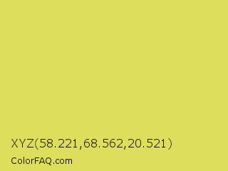 XYZ 58.221,68.562,20.521 Color is a light yellow color and the nearest color is Confetti #e9d75a. Hex code #dede5d and RGB value is rgb(222,222,93). In RGB color space, this color is composed of 87% red, 87% green, 36% blue, In CMYK color space, this color is composed of 0% cyan, 0% magenta, 58% yellow , 13% black , In HSL color space, this color has a hue angle of 60° , 66% saturation and 62% lightness.