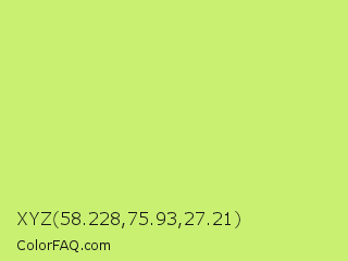 XYZ 58.228,75.93,27.21 Color is a light lime color and the nearest color is Sulu #c1f07c. Hex code #c9f071 and RGB value is rgb(201,240,113). In RGB color space, this color is composed of 79% red, 94% green, 44% blue, In CMYK color space, this color is composed of 16% cyan, 0% magenta, 53% yellow , 6% black , In HSL color space, this color has a hue angle of 78° , 81% saturation and 69% lightness.