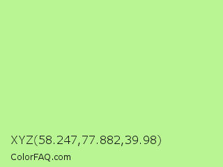 XYZ 58.247,77.882,39.98 Color is a light green color and the nearest color is Reef #c9ffa2. Hex code #baf594 and RGB value is rgb(186,245,148). In RGB color space, this color is composed of 73% red, 96% green, 58% blue, In CMYK color space, this color is composed of 24% cyan, 0% magenta, 40% yellow , 4% black , In HSL color space, this color has a hue angle of 96° , 83% saturation and 77% lightness.