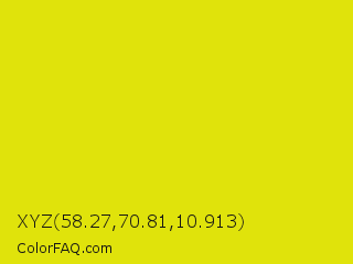 XYZ 58.27,70.81,10.913 Color is a normal yellow color and the nearest color is Piss Yellow #e1e115. Hex code #e0e30b and RGB value is rgb(224,227,11). In RGB color space, this color is composed of 88% red, 89% green, 4% blue, In CMYK color space, this color is composed of 1% cyan, 0% magenta, 95% yellow , 11% black , In HSL color space, this color has a hue angle of 61° , 91% saturation and 47% lightness.
