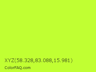 XYZ 58.328,83.088,15.981 Color is a normal lime color and the nearest color is Green Yellow #adff2f. Hex code #c1ff32 and RGB value is rgb(193,255,50). In RGB color space, this color is composed of 76% red, 100% green, 20% blue, In CMYK color space, this color is composed of 24% cyan, 0% magenta, 80% yellow , 0% black , In HSL color space, this color has a hue angle of 78° , 100% saturation and 60% lightness.