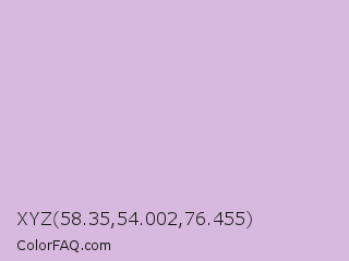 XYZ 58.35,54.002,76.455 Color is a light purple color and the nearest color is Thistle #d8bfd8. Hex code #d7b8de and RGB value is rgb(215,184,222). In RGB color space, this color is composed of 84% red, 72% green, 87% blue, In CMYK color space, this color is composed of 3% cyan, 17% magenta, 0% yellow , 13% black , In HSL color space, this color has a hue angle of 289° , 37% saturation and 80% lightness.