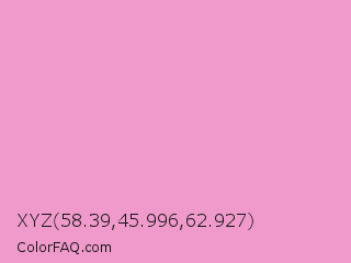 XYZ 58.39,45.996,62.927 Color is a light magenta color and the nearest color is Pastel Magenta #f49ac2. Hex code #f09acc and RGB value is rgb(240,154,204). In RGB color space, this color is composed of 94% red, 60% green, 80% blue, In CMYK color space, this color is composed of 0% cyan, 36% magenta, 15% yellow , 6% black , In HSL color space, this color has a hue angle of 325° , 74% saturation and 77% lightness.