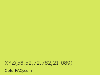 XYZ 58.52,72.782,21.089 Color is a light yellow color and the nearest color is Maximum Green Yellow #d9e650. Hex code #d6e85c and RGB value is rgb(214,232,92). In RGB color space, this color is composed of 84% red, 91% green, 36% blue, In CMYK color space, this color is composed of 8% cyan, 0% magenta, 60% yellow , 9% black , In HSL color space, this color has a hue angle of 68° , 75% saturation and 64% lightness.