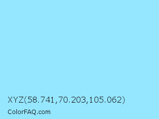 XYZ 58.741,70.203,105.062 Color is a light blue color and the nearest color is Anakiwa #9de5ff. Hex code #95e6ff and RGB value is rgb(149,230,255). In RGB color space, this color is composed of 58% red, 90% green, 100% blue, In CMYK color space, this color is composed of 42% cyan, 10% magenta, 0% yellow , 0% black , In HSL color space, this color has a hue angle of 194° , 100% saturation and 79% lightness.