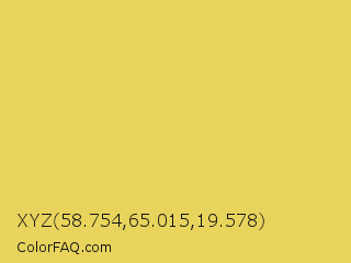 XYZ 58.754,65.015,19.578 Color is a light yellow color and the nearest color is Confetti #e9d75a. Hex code #e8d45c and RGB value is rgb(232,212,92). In RGB color space, this color is composed of 91% red, 83% green, 36% blue, In CMYK color space, this color is composed of 0% cyan, 9% magenta, 60% yellow , 9% black , In HSL color space, this color has a hue angle of 51° , 75% saturation and 64% lightness.