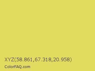XYZ 58.861,67.318,20.958 Color is a light yellow color and the nearest color is Confetti #e9d75a. Hex code #e3da60 and RGB value is rgb(227,218,96). In RGB color space, this color is composed of 89% red, 85% green, 38% blue, In CMYK color space, this color is composed of 0% cyan, 4% magenta, 58% yellow , 11% black , In HSL color space, this color has a hue angle of 56° , 70% saturation and 63% lightness.