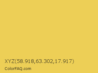 XYZ 58.918,63.302,17.917 Color is a light yellow color and the nearest color is Confetti #e9d75a. Hex code #edcf56 and RGB value is rgb(237,207,86). In RGB color space, this color is composed of 93% red, 81% green, 34% blue, In CMYK color space, this color is composed of 0% cyan, 13% magenta, 64% yellow , 7% black , In HSL color space, this color has a hue angle of 48° , 81% saturation and 63% lightness.