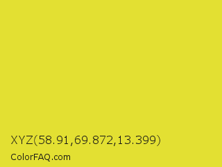 XYZ 58.91,69.872,13.399 Color is a normal yellow color and the nearest color is Dandelion #f0e130. Hex code #e3e032 and RGB value is rgb(227,224,50). In RGB color space, this color is composed of 89% red, 88% green, 20% blue, In CMYK color space, this color is composed of 0% cyan, 1% magenta, 78% yellow , 11% black , In HSL color space, this color has a hue angle of 59° , 76% saturation and 54% lightness.